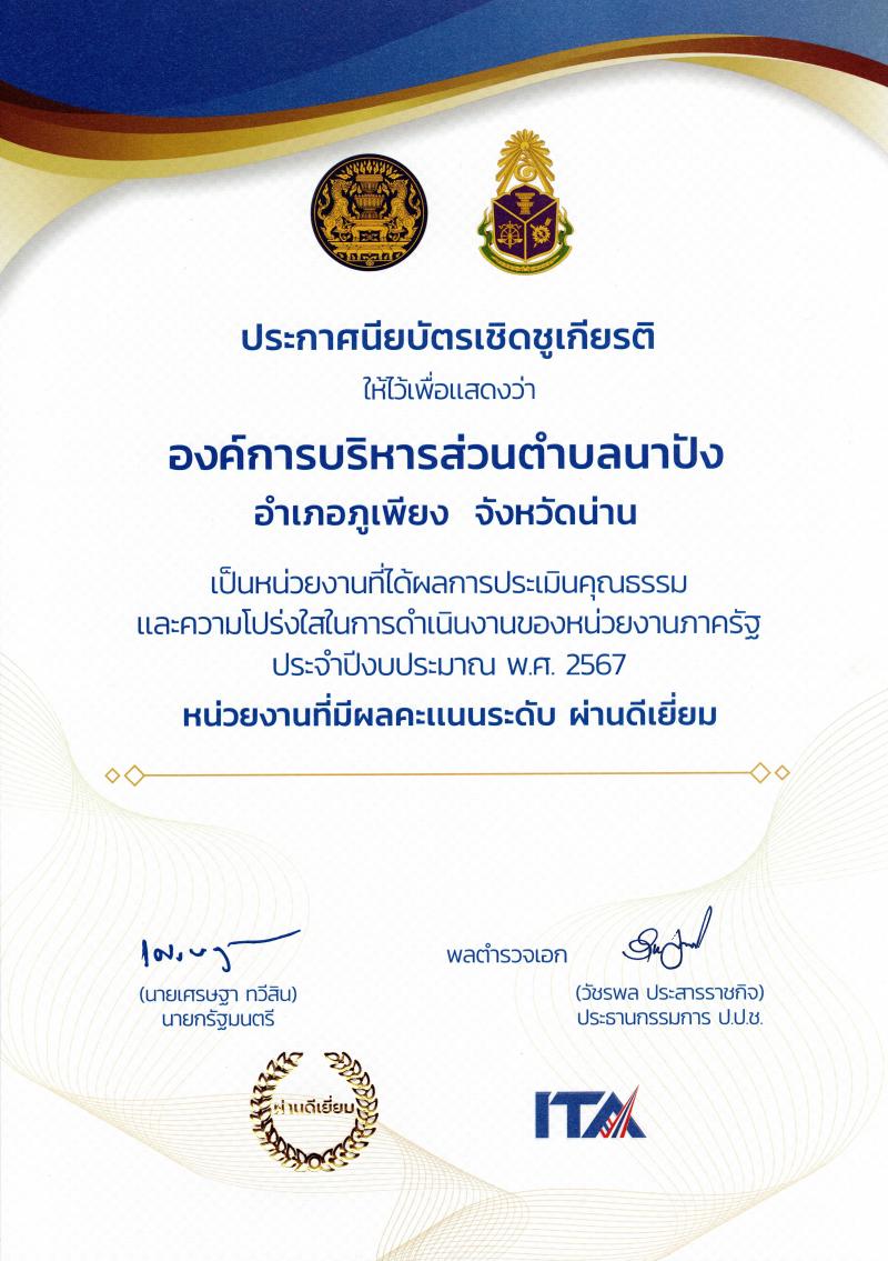รายละเอียด : วันที่ 9 ธันวาคม 2567 องค์การบริหารส่วนตำบลนาปัง เข้าร่วมงานวันต่อต้านคอรัปชั่นสากล (ประเทศไทย) และรับประกาศนียบัตรหน่วยงานที่ได้รับผลการประเมินคุณธรรมและความโปร่งใสในการดำเนินงานของหน่วยงานภาครัฐ ประจำปีงบประมาณ พ.ศ. 2567 ได้รับ ระดับผ่านดีเยี่ยม คะแนน 98.91 ณ ห้องประชุมพระเจ้าสุริยพงษ์ผริตเดช ชั้น 3 ศาลากลางจังหวัดน่าน