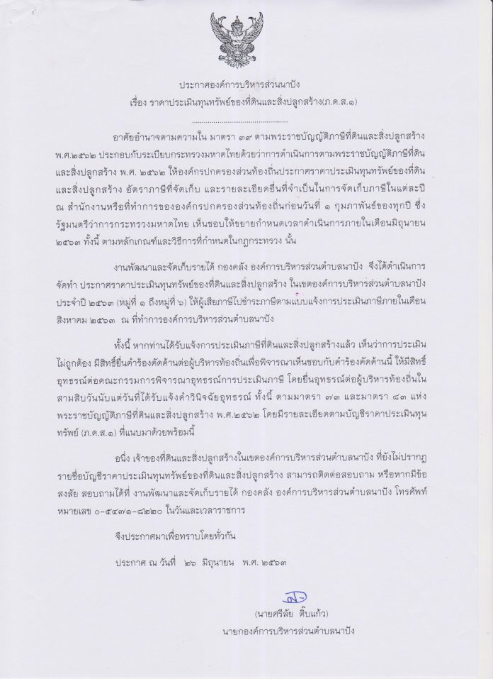 ประกาศองค์การบริหารส่วนนาปัง เรื่อง ราคาประเมินทุนทรัพย์ของที่ดินและสิ่งปลูกสร้าง (ภ.ค.ส.๑)