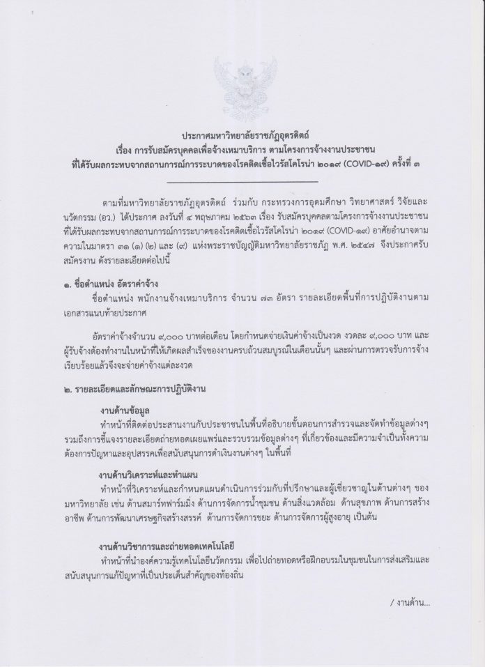 ชื่อเรื่อง : ประชาสัมพันธ์ มหาวิทยาลัยราชภัฏอุตรดิตถ์ เปิดรับสมัครบุคคลเพื่อจ้างเหมาบริการ ตามโครงการจ้างงานประชาชน ที่ได้รับผลกระทบจากสถานการณ์การระบาดของโรคติดเชื้อไวรัสโคโรน ๒๐๑๙ (COVID-๑๙) ครั้งที่ ๓