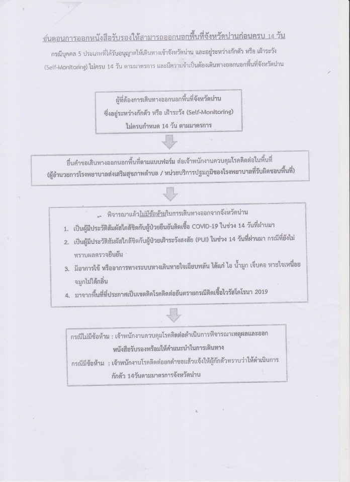 ประชาสัมพันธ์ขั้นตอนการปฏิบัติ ผู้ที่ต้องการออกนอกพื้นที่จังหวัดน่าน ตามประกาศจังหวัดน่าน ในการป้องกันโรค COVID-19