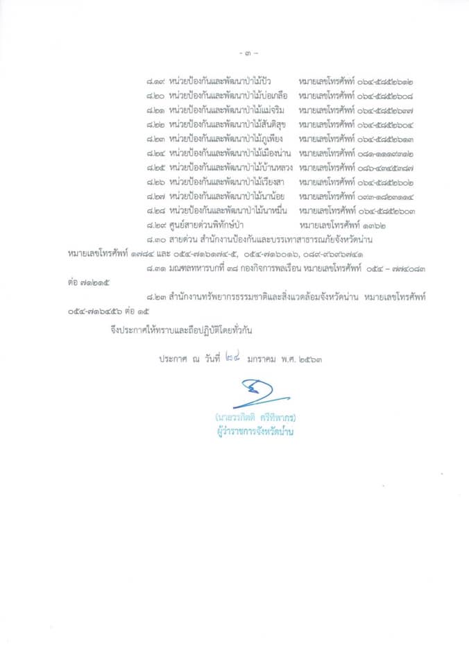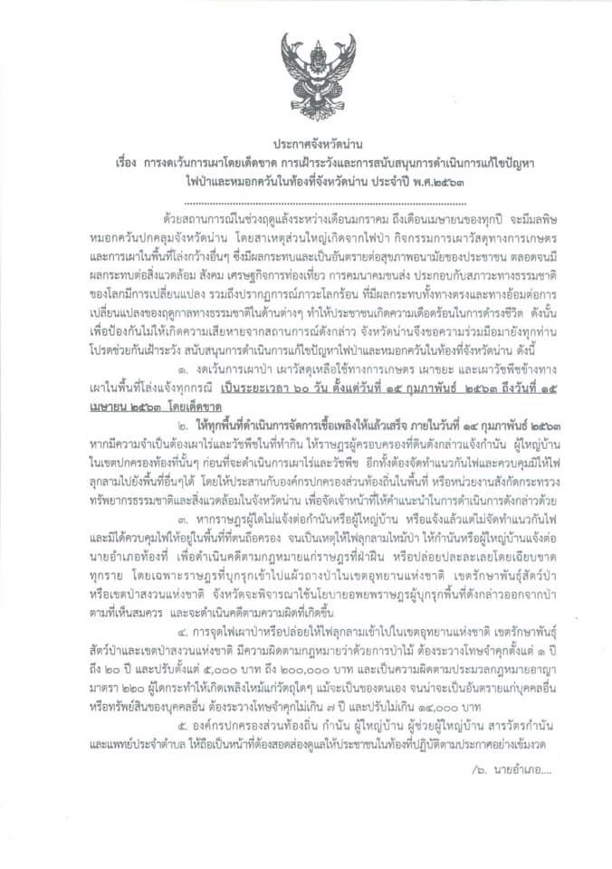 ชื่อเรื่อง : ประชาสัมพันธ์ประกาศจังหวัดน่าน เรื่อง การงดเว้นเผาโดยเด็ดขาด การเฝ้าระวังและสนับสนุน การดำเนินการแก้ไขปัญหาไฟป่าและหมอกควันในพื้นที่จังหวัดน่าน 15 ก.พ. ถึง 15 เม.ย. 2563