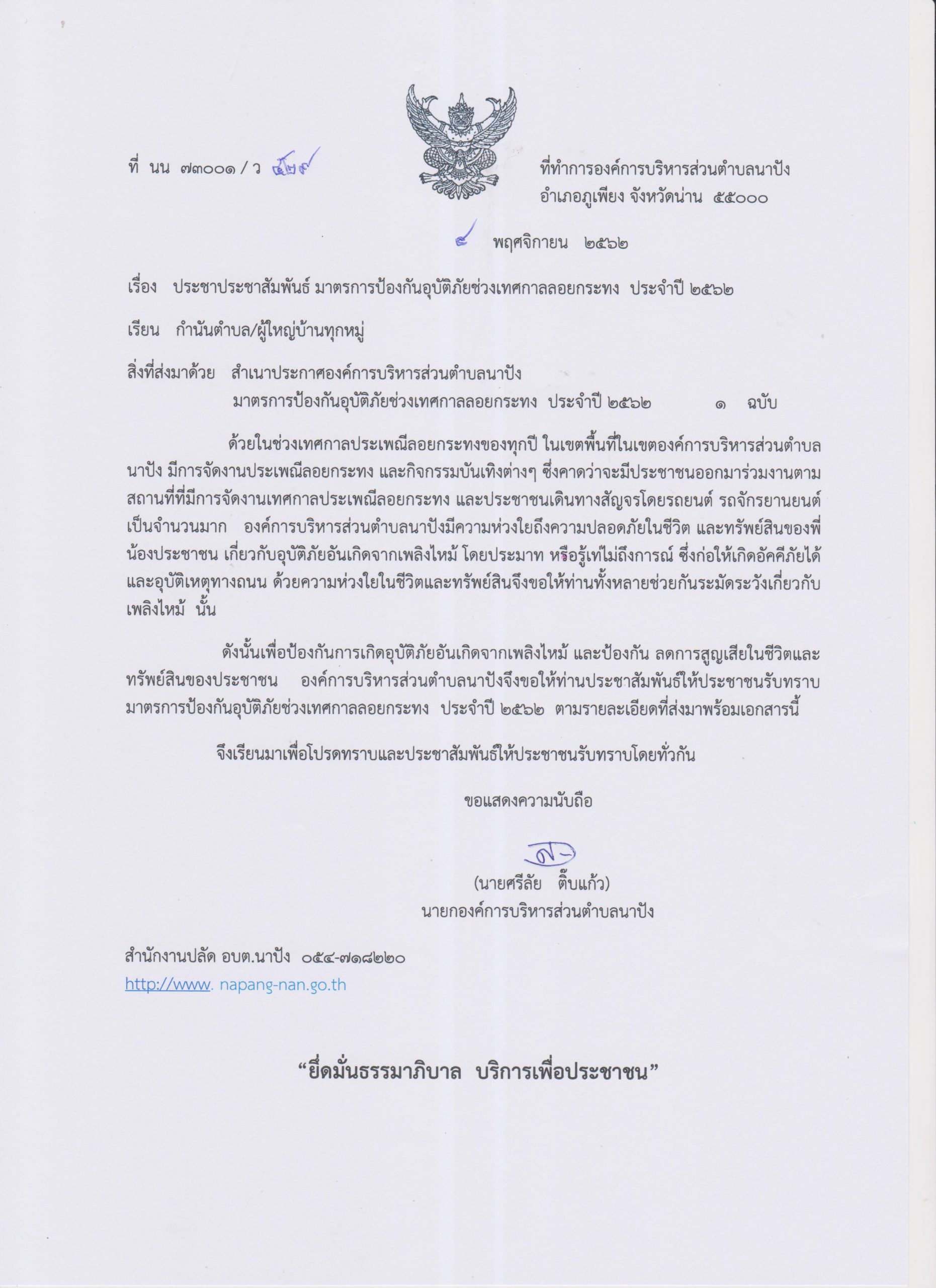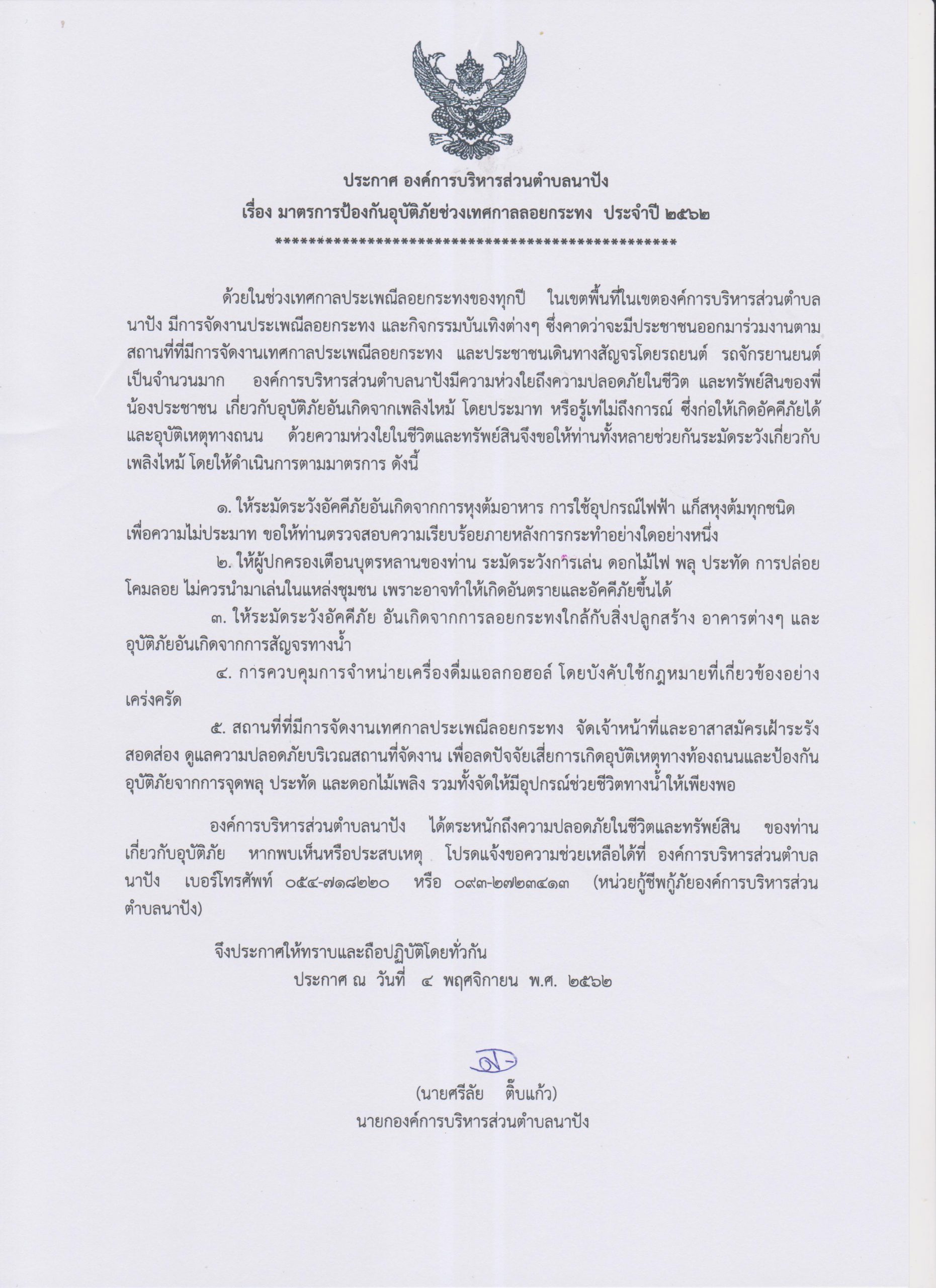 ประกาศ องค์การบริหารส่วนตำบลนาปัง เรื่อง มาตรการป้องกันอุบัติภัยช่วงเทศกาลลอยกระทง ประจำปี 2562
