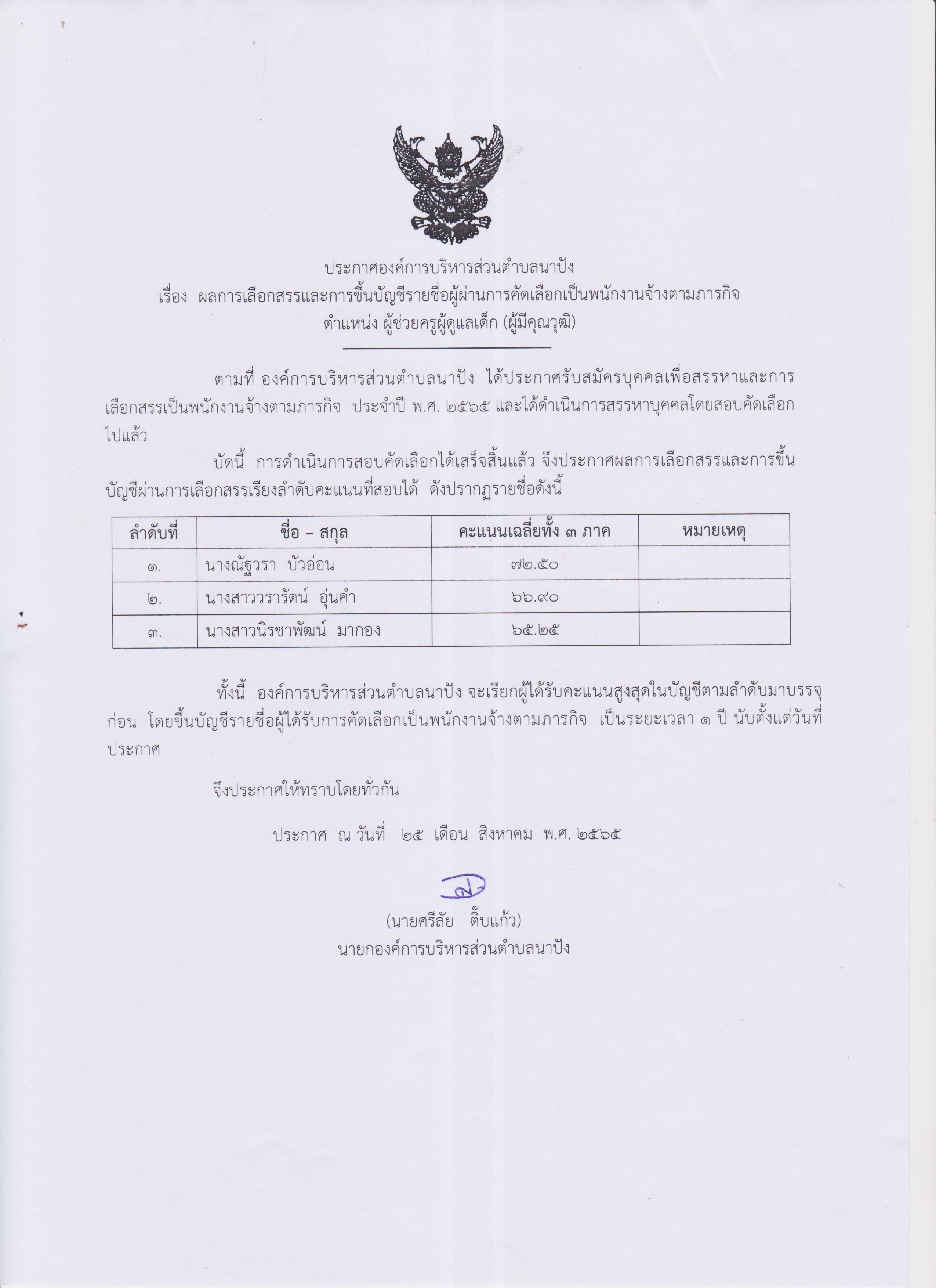 ประกาศ เรื่อง ผลการเลือกสรรและการขึ้นบัญชีรายชื่อผู้ผ่านการคัดเลือกเป็นพนักงานจ้างตามภารกิจ ตำแหน่ง ผู้ช่วยครูผู้ดูแลเด็ก (ผู้มีคุณวุฒิ)