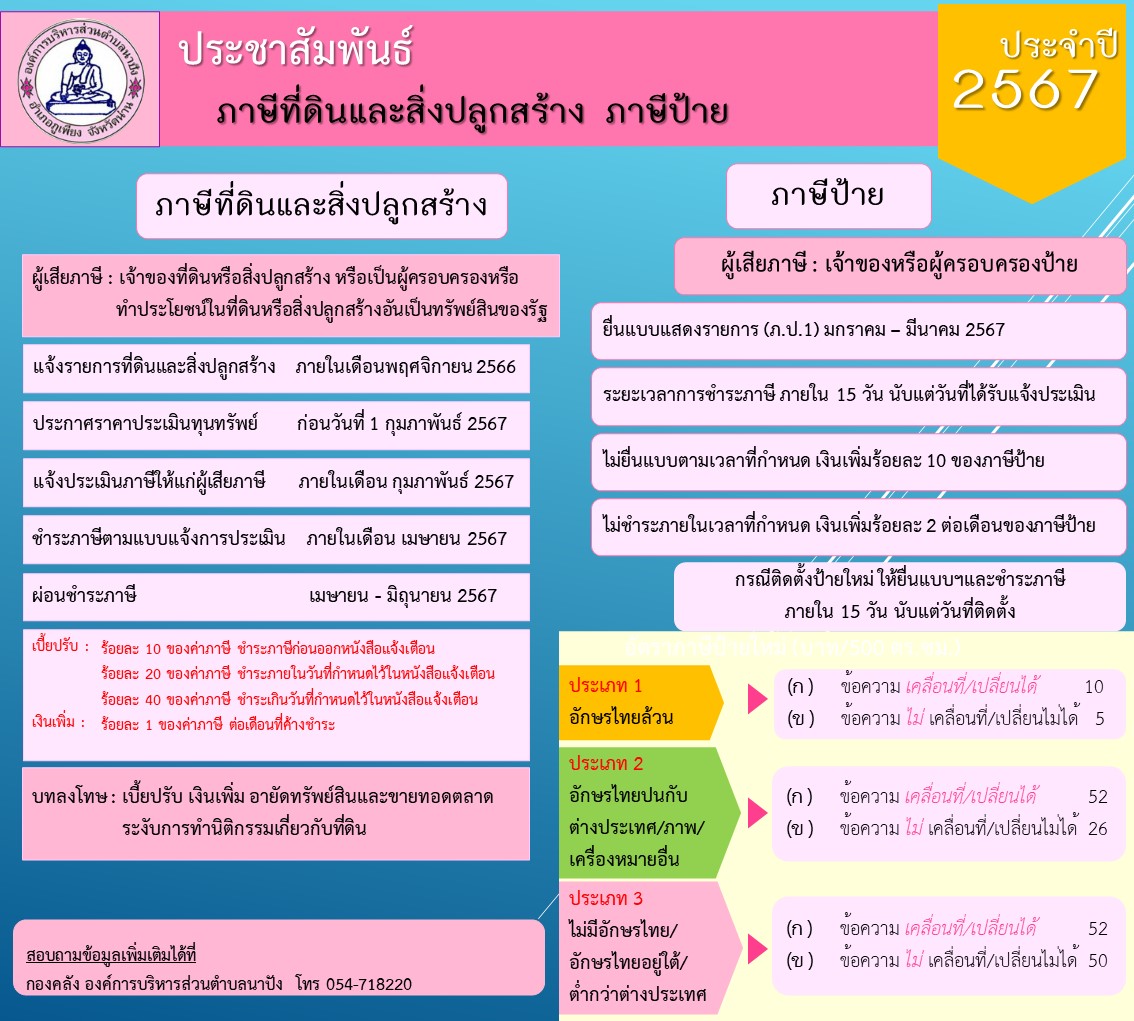 องค์การบริหารส่วนตำบลนาปัง ขอประชาสัมพันธ์ ภาษีที่ดินและสิ่งปลูกสร้าง ภาษีป้าย ประจำปี 2567