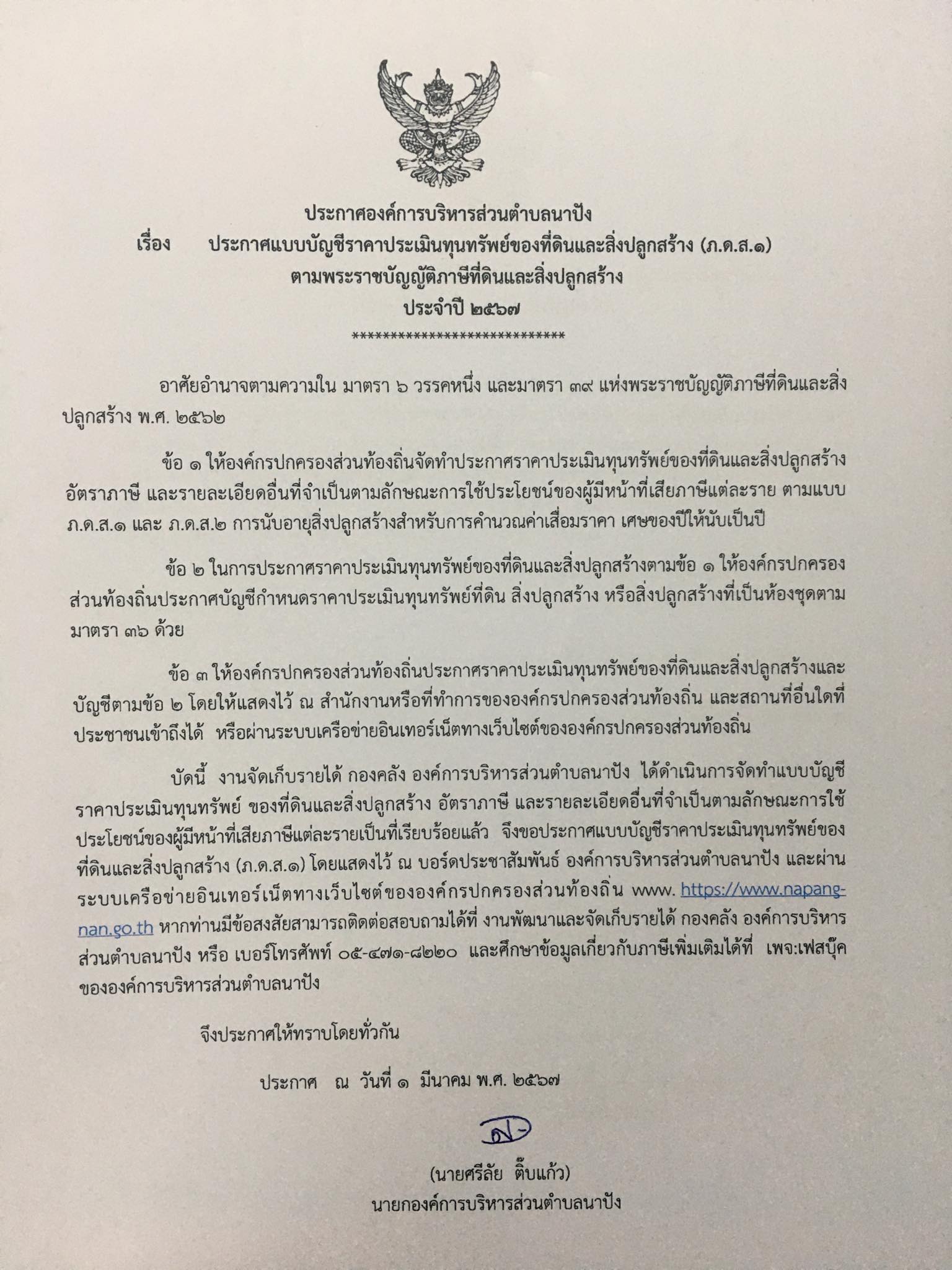 ชื่อเรื่อง : ประกาศประชาสัมพันธ์องค์การบริหารส่วนตำบลนาปัง เรื่อง ประกาศแบบบัญชีราคาประเมินทุนทรัพย์ของที่ดินและสิ่งปลูกสร้าง (ภ.ด.ส.1) ตามพระราชบัญญัติภาษีที่ดินและสิ่งปลูกสร้าง ประจำปี 2567