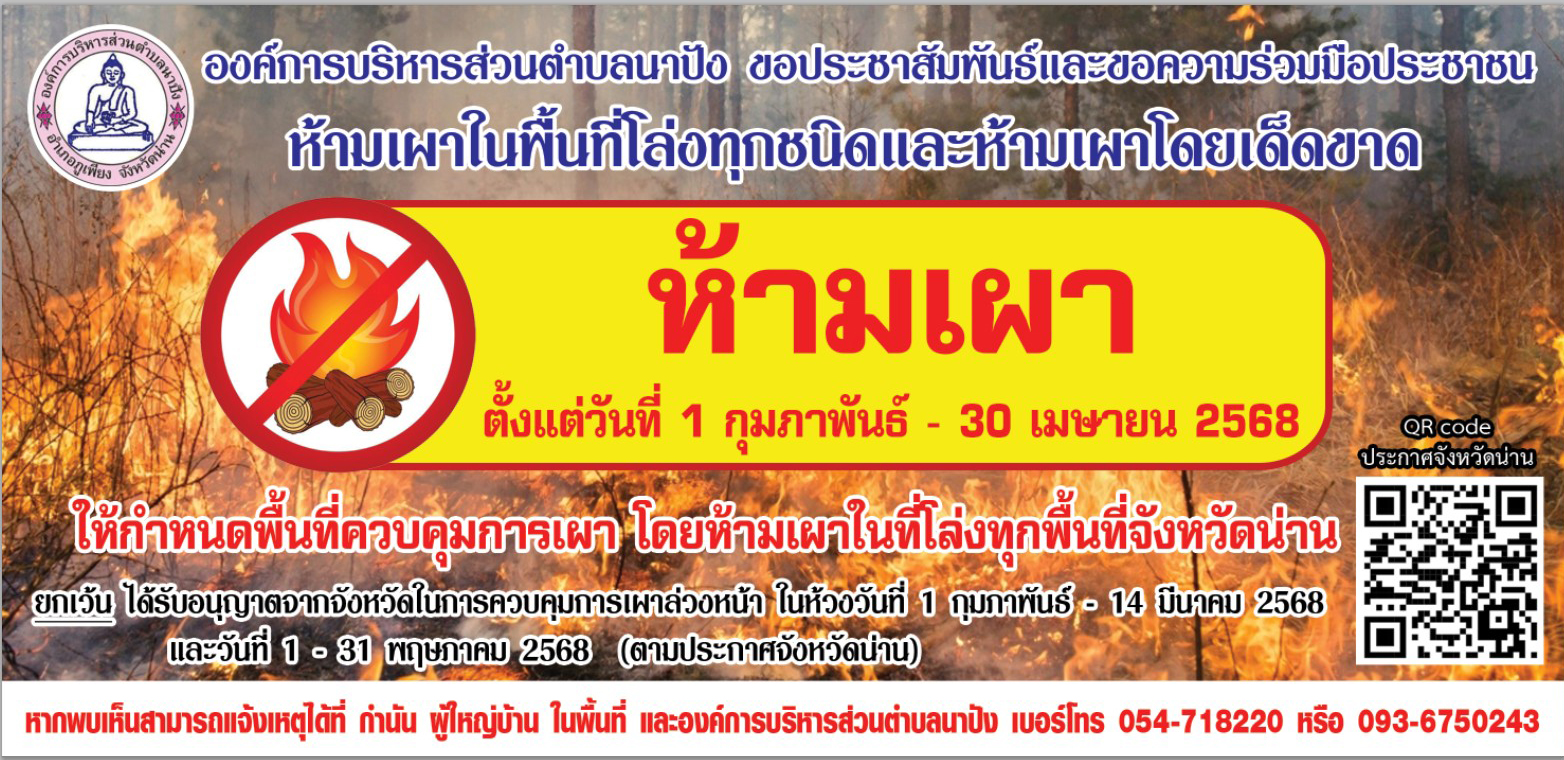 ชื่อเรื่อง : ประชาสัมพันธ์ประกาศจังหวัดน่าน กำหนดพื้นที่ควบคุมการเผาในพื้นที่โล่งทุกชนิดและห้ามเผาโดยเด็ดขาดเพื่อแก้ไขปัญหาไฟป่า หมอกควันและฝุ่นละอองขนาดเล็ก (PM 2.5) ในพื้นที่จังหวัดน่าน ประจำปี พ.ศ. 2568