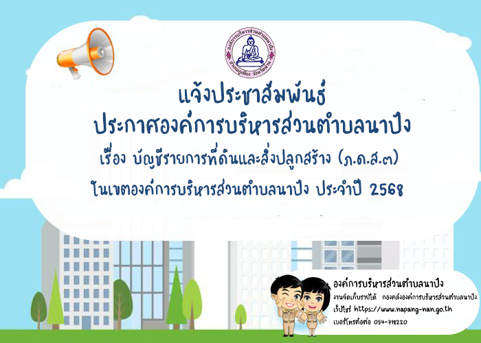 ชื่อเรื่อง : องค์การบริหารส่วนตำบลนาปังแจ้งประชาสัมพันธ์ประกาศองค์การบริหารส่วนตำบลนาปัง เรื่อง บัญชีรายการที่ดินและสิ่งปลูกสร้าง (ภ.ด.ส.3) ในเขตองค์การบริหารส่วนตำบลนาปัง ประจำปี 2568