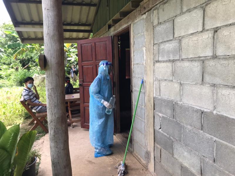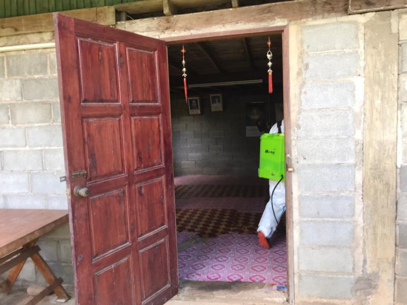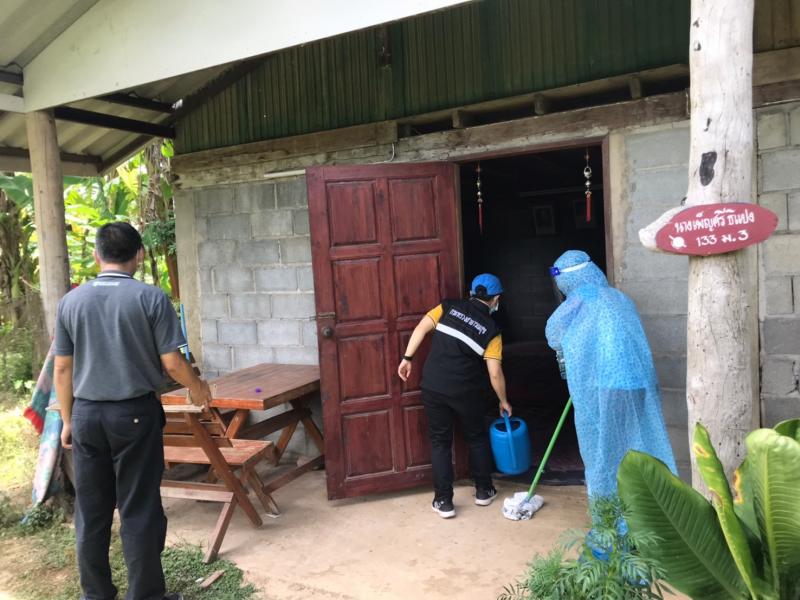 กิจกรรมทำความสะอาดสิ่งแวดล้อมบริเวณบ้านผู้ติดเชื้อโควิด บ้านม่วงใหม่ หมู่ 3
