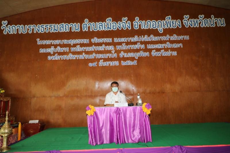 รายละเอียด : วันที่ 14 กันยายน 2565 องค์การบริหารส่วนตำบลนาปัง ดำเนินโครงการอบรมคุณธรรม จริยธรรม และความโปร่งใสในการดำเนินงานขององค์การบริหารส่วนตำบลนาปังให้แก่ผู้บริหาร พนักงานส่วนตำบล พนักงานจ้างและสมาชิกสภาองค์การบริหารส่วนตำบล ณ วังกาบรางธรรมสถาน ตำบลเมืองจัง อำเภอภูเพียง จังหวัดน่าน เพื่อเป็นการส่งเสริมส่งเสริมให้คณะผู้บริหาร สมาชิกสภาฯ พนักงานส่วนตำบล ลูกจ้างและพนักงานจ้างขององค์การบริหารส่วนตำบลนาปัง ให้ข้าราชการและเจ้าหน้าที่ของรัฐทุกระดับ มีความรู้ความเข้าใจและยึดมั่นในหลักคุณธรรม จริยธรรม และนำหลักธรรมทางพระพุทธศาสนามาปรับใช้ในการปฏิบัติงานให้บรรลุผลสัมฤทธิ์ และความโปร่งใสและเป็นธรรม